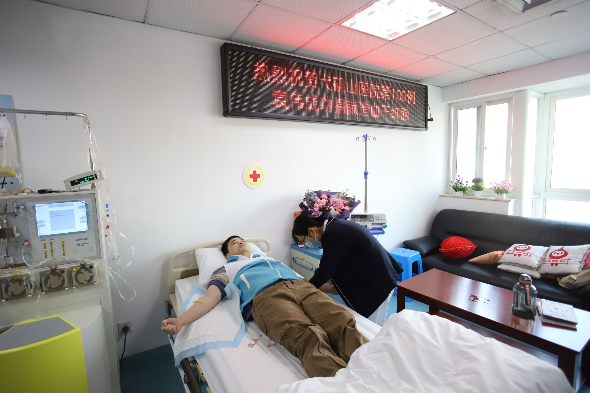 1月8日上午,在我校第一附属医院血液内科造血干细胞采集室内,当殷红的血液从袁伟的身体里缓缓流出,255ml造血干细胞混悬液顺利采集,标志着医院第100例中华骨髓库造血干细胞捐献成功完成。由此,我校第一附属医院成为全省第二家同类采集量过百的医院,其中非血缘造血干细胞移植数量位居全省首位。