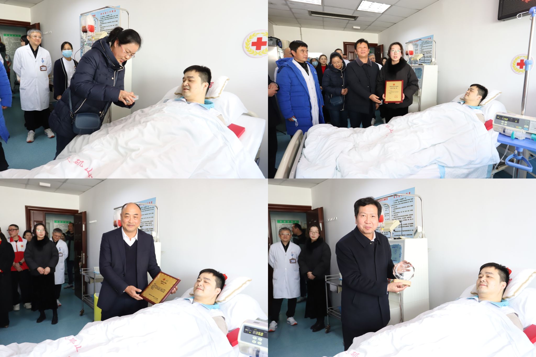 安徽省红十字会四级调研员陶慧慧,芜湖市红十字会专职副会长孙飏,第一附属医院及血液内科、输血科相关负责人看望了捐献者袁伟,向其颁发荣誉证书和纪念奖牌。