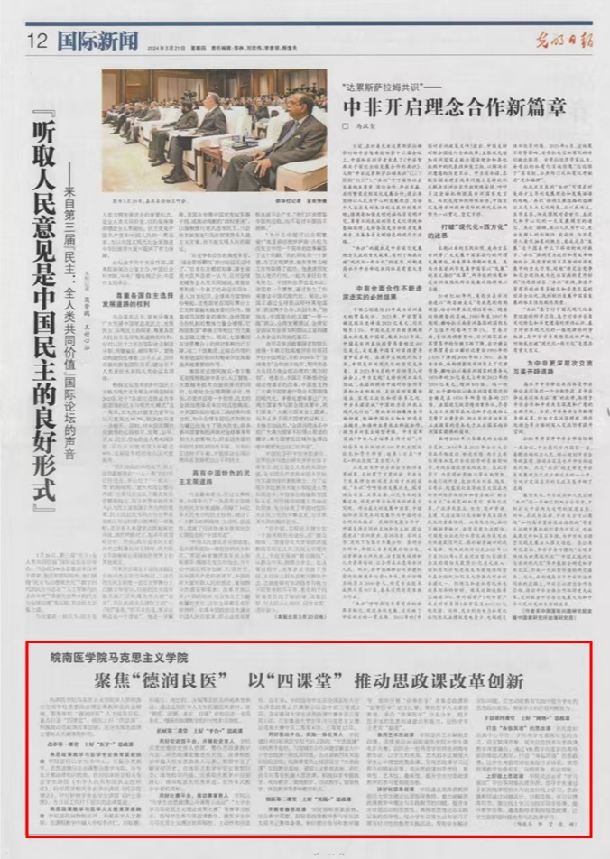 二是育人模式更趋完善。立足医学特色,构建“德润良医”育人品牌,打造“四课堂”融通机制。相关典型经验被《光明日报》《安徽教育》等主流媒体、政府内参报道和收录。深化课程思政改革,《大思政视域下医学院校“五纬并进”课程思政育人模式实践探索》等思政育人模式获批安徽省教学成果奖特等奖和一、二、三等奖各1项。