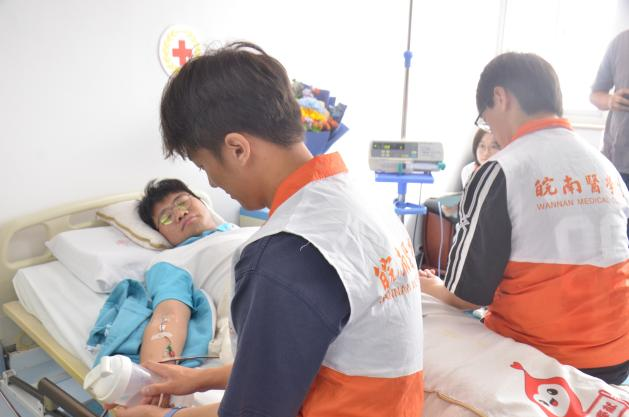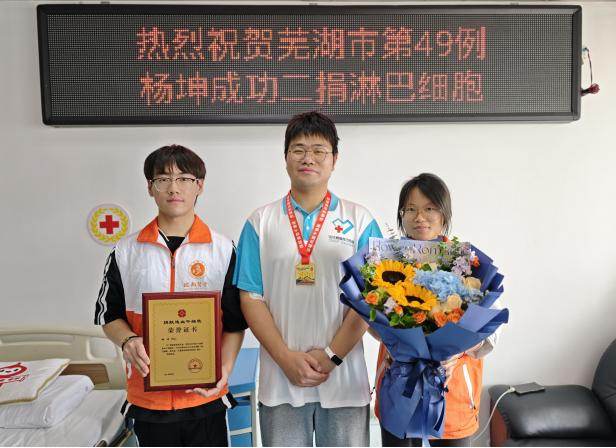 为延续血液病患者生命希望,传递医者仁心的大爱情怀,6月25日上午,在弋矶山医院血液内科病房内,公共卫生学院预防医学专业2023级学生杨坤顺利完成淋巴细胞捐献,成为安徽省第772例、芜湖市第49例、我校在校大学生第7例捐献者。这是他继为血液病患儿捐献造血干细胞后,第二次为患者挺身而出,成为芜湖市首例完成二次捐献的在校大学生。