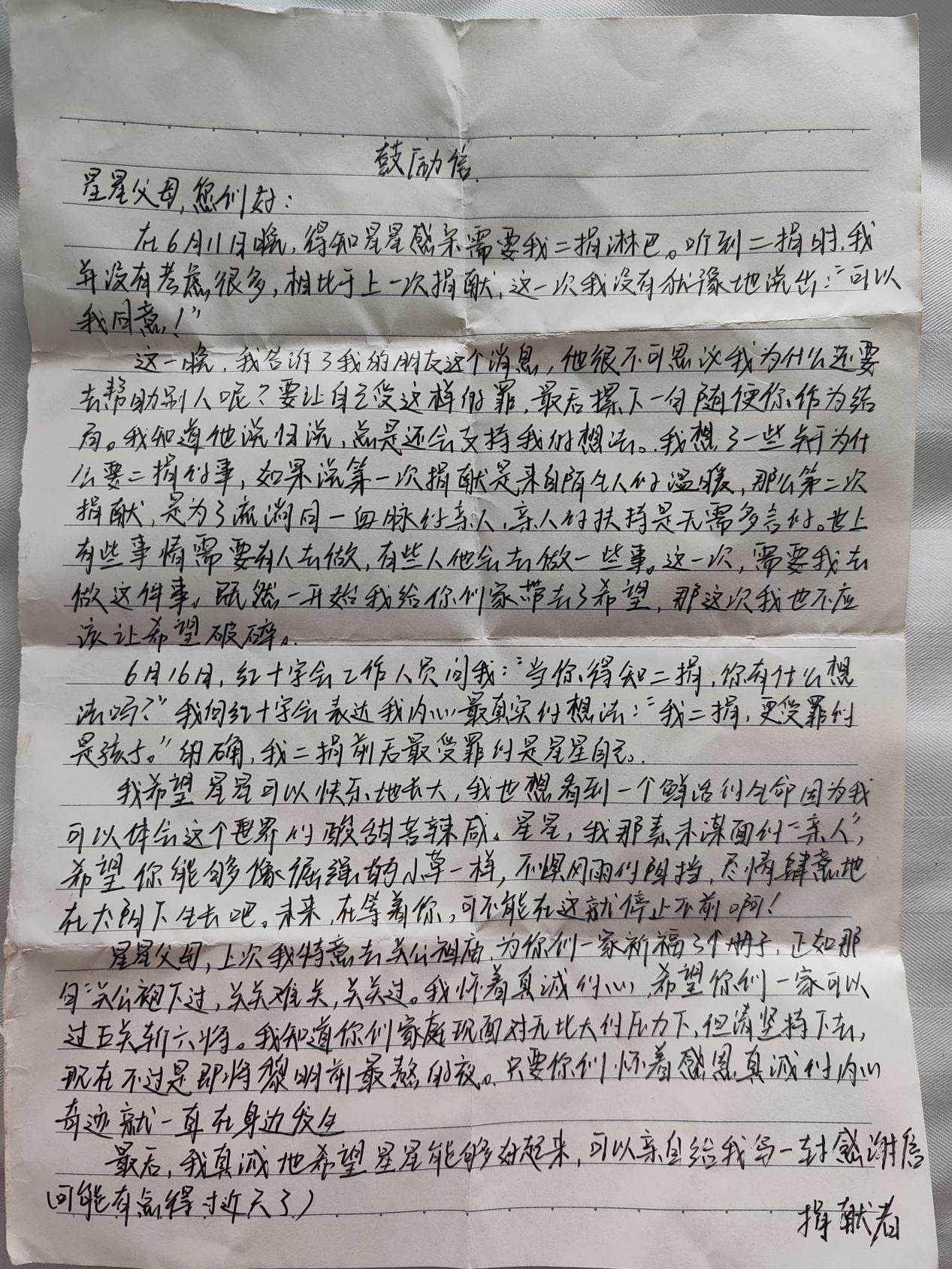 2025年4月1日,杨坤通过中华骨髓库配型成功后,毫不犹豫地完成了造血干细胞捐献,成为我校在校生第4例造血干细胞捐献者。6月初,当得知受捐者因病情需要接受淋巴细胞移植时,他毅然同意二次捐献。杨坤说:“只要能救人,我随时准备着!”。于是,他一边紧张地准备期末考试,一边以近乎严苛的自律配合完成身体准备和各项检查,为那位“素未谋面的家人”筑起生命防线。杨坤十分牵挂受捐者的健康状况,在捐献结束后顾不上身体的不适,写了一份鼓励信请志愿者转交给受捐者。