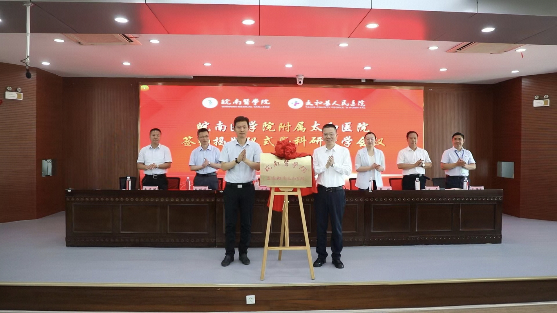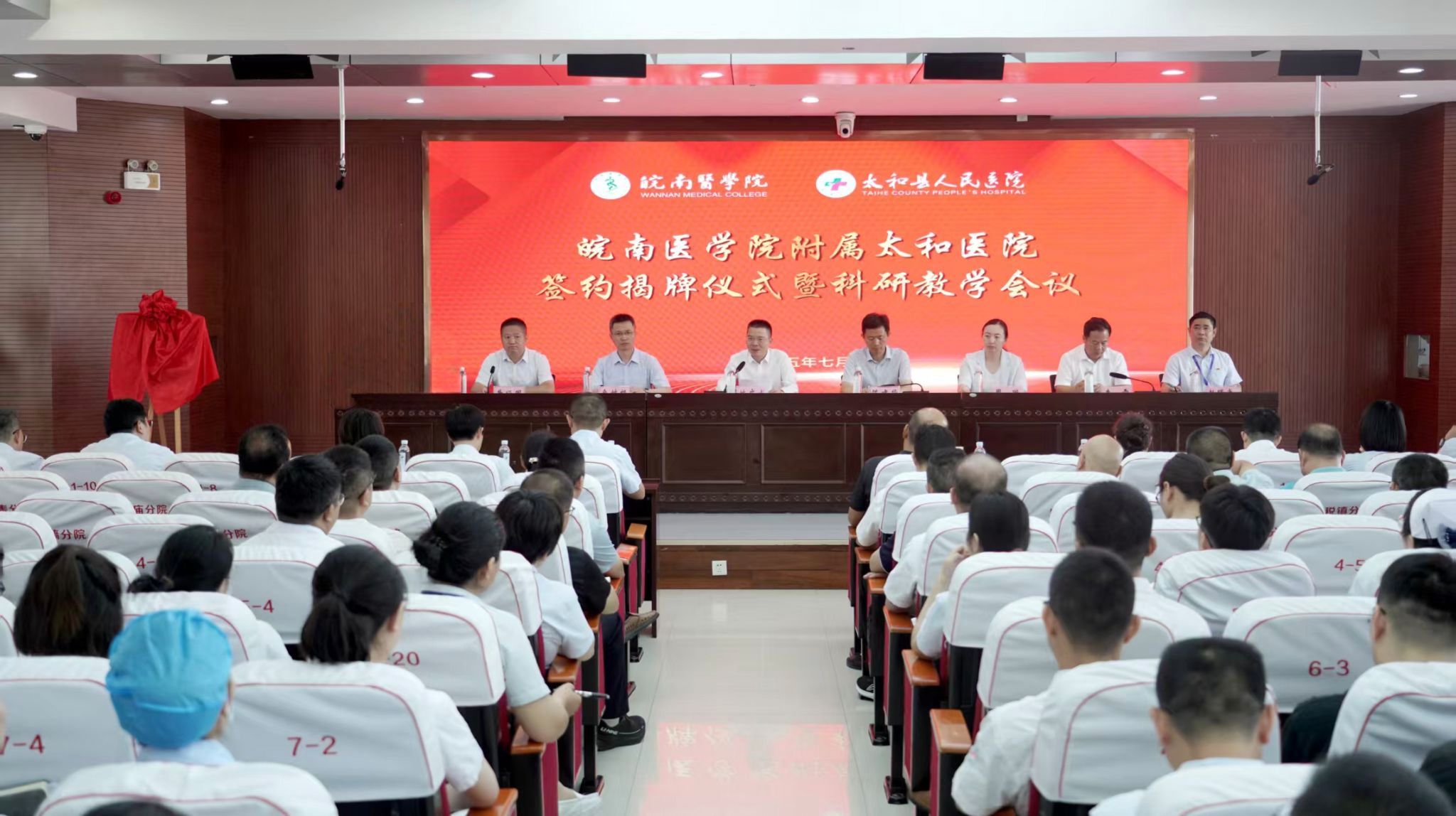 学校办公室、发展规划处(医院管理处)、教务处、科研处负责人,附属太和县医院党政领导班子成员、中层干部、医护员工代表参加仪式。(黄霆/文  附属太和医院/供图)