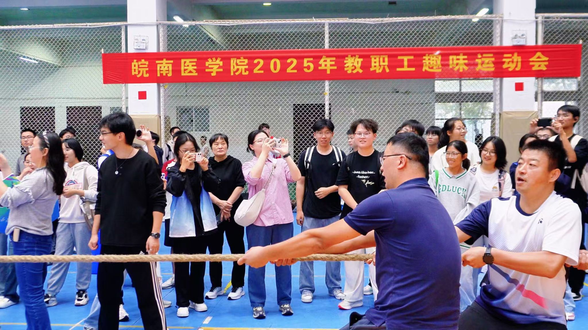 随后登场的“凝心聚力”(男、女混合团体拔河)项目,更是将全场热情彻底点燃。参赛队伍紧握长绳,身体后倾、重心下沉,眼神坚定地盯着前方。“一二!一二!” 伴随着整齐有力的口号,队员们劲往一处使、心往一处聚,红色绳结在中线两侧来回拉锯,每一次牵动都扣动着在场所有人的心弦。场边啦啦队的呐喊声震耳欲聋,加油手势整齐划一,助威声与号子声交织在一起,汇成团结奋进的 “皖医强音”。