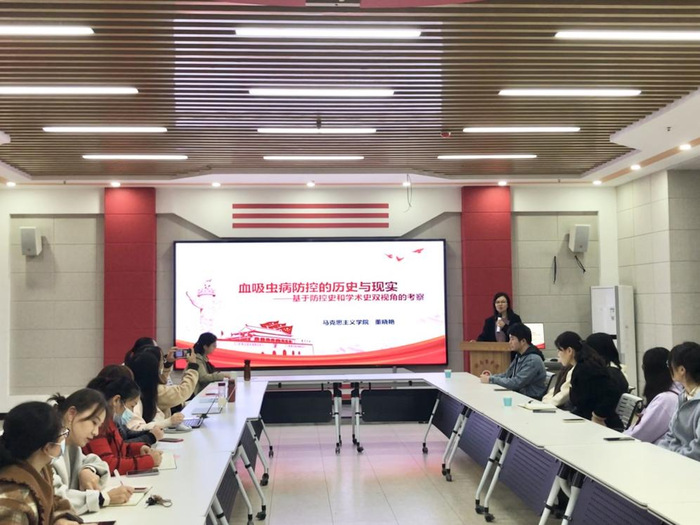 马克思主义学院董晓艳博士作题为血吸虫病防控的历史与现实——基于防控史和学术史双视角的考察的学术讲座。首先介绍了血吸虫病的基本情况,从血吸虫病的防控史和学术史两方面进行阐释,全面梳理了中国历史上特别是新中国成立以来,我国血吸虫病防控政策发展历程,以此为基础,从学理角度分析了防控政策演变的内在原因。她指出,一切历史都是当代史,回顾防控史的实践,对于我们做好当今的卫生防疫工作,保障人民群众生命健康,具有启意义;梳理血吸虫病学术史则有助于明晰血防史研究的前沿问题,以深入探究未来研究路向。