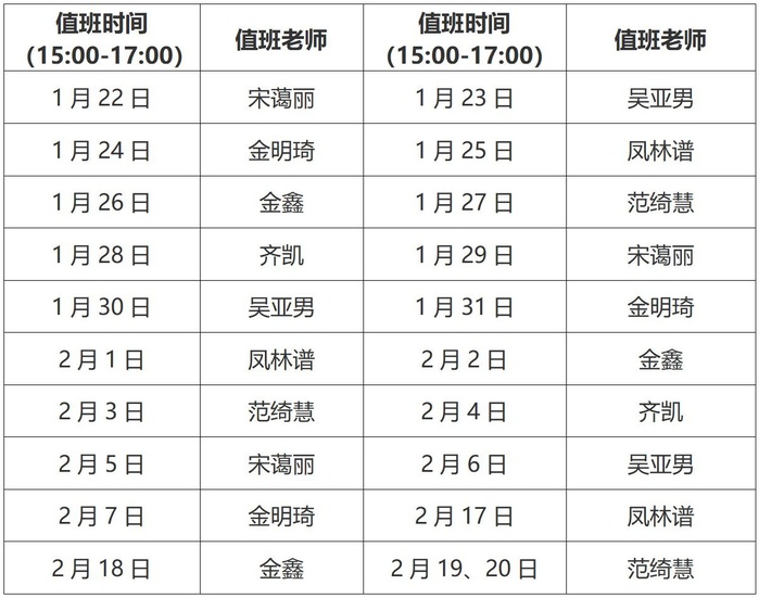 1.值班时间:2024年1月22日-2月7日,2月17 日-2月20日,15:00-17:00